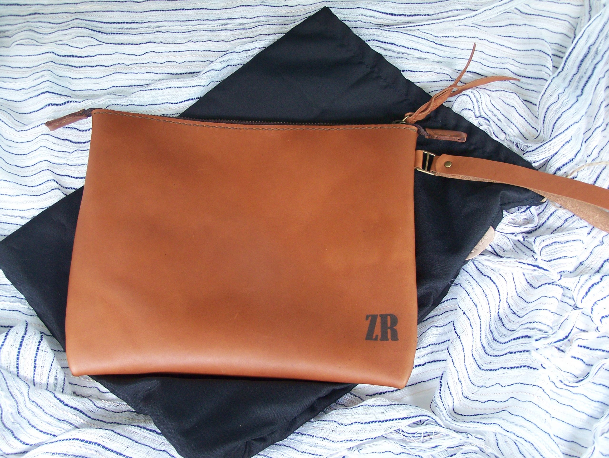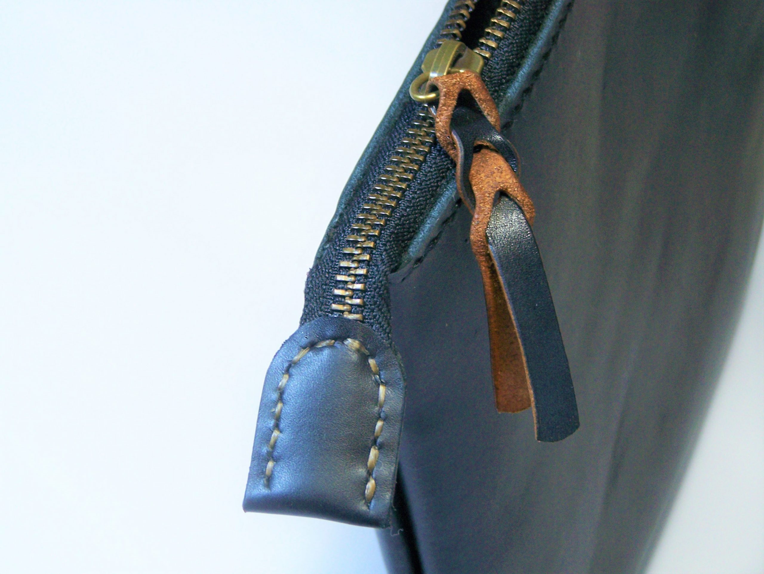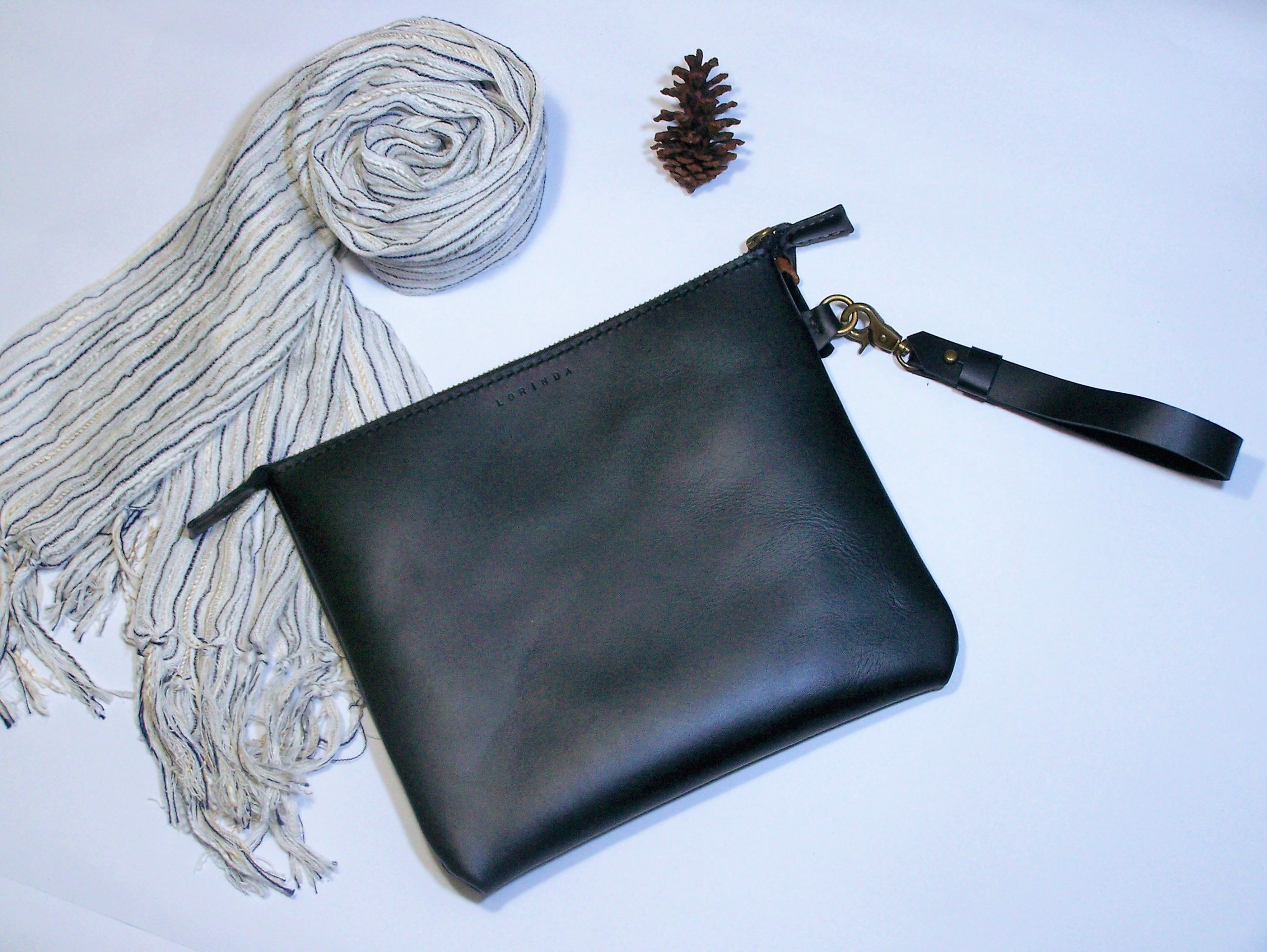 Clutch model simpel dengan teknik pembuatan secara handmade dan dijahit tangan menggunakan benang polyester wax dan sinew pada bagian handle, bahan menggunakan kulit sapi pilihan dengan textur halus dan tahan air.