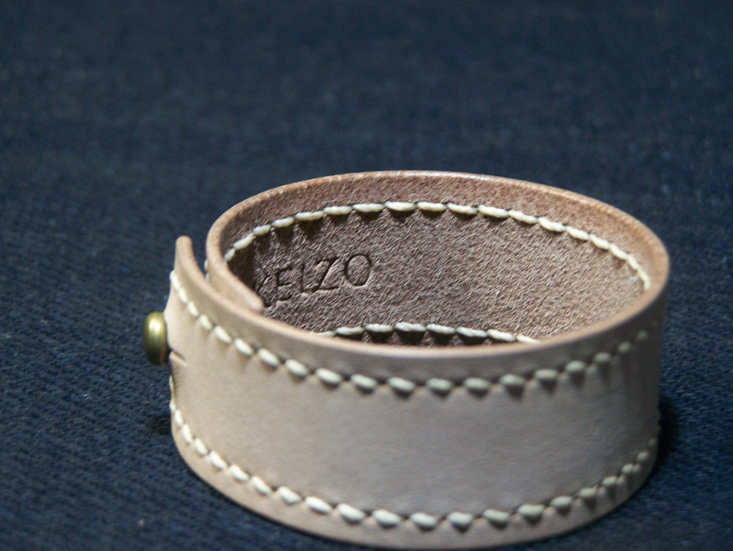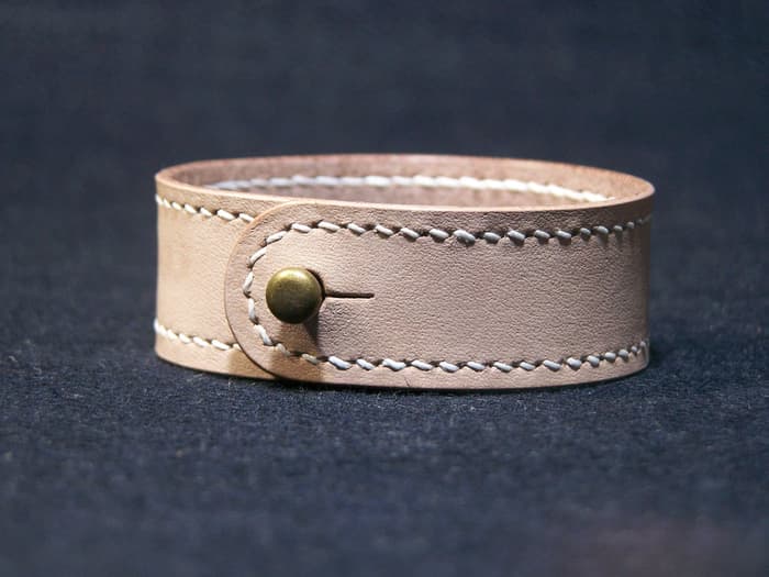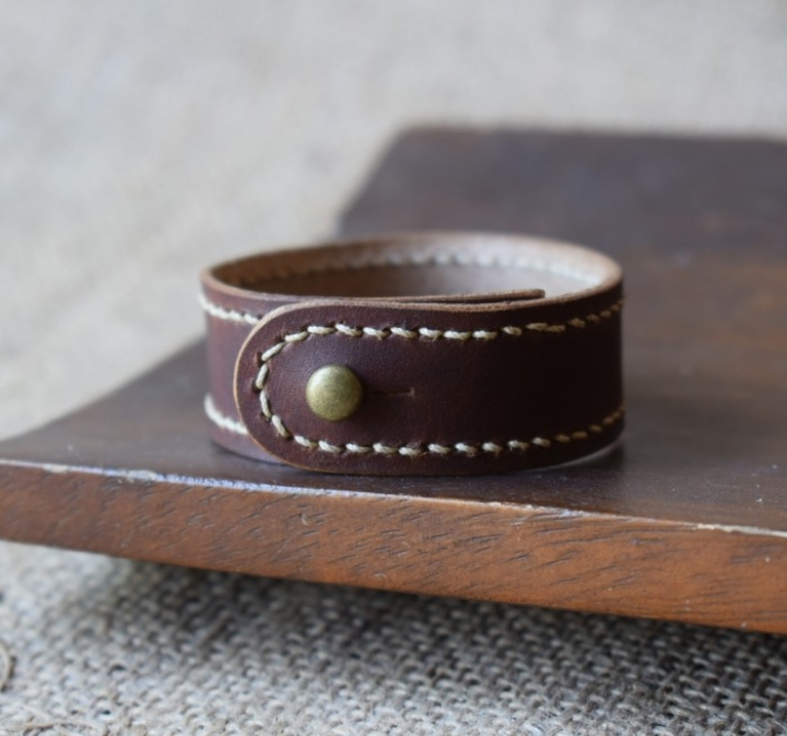 Gelang Berbahan dasar kulit Natural Vegtan yang dikerjakan dengan tehnik Handmade. Gelang ini memiliki aksen jahitan dekoratif di bagian pinggir yang di jahit secara manual sehingga memiliki detail jahitan yang menarik.