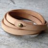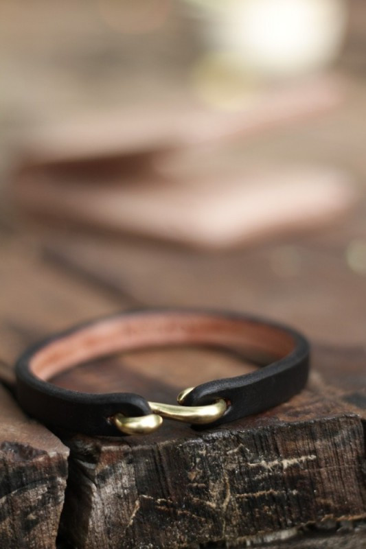 Gelang dengan bahan vegtan leather dikombinasikan dengan hardware berbahan kuningan, kedua material yang teksturnya akan bertambah unik seiring dengan pemakaian