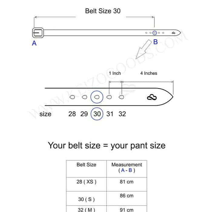 Desain Leather Belt Keizo adalah size fit dengan ujung sabuk berada di antara belt loop pertama dan