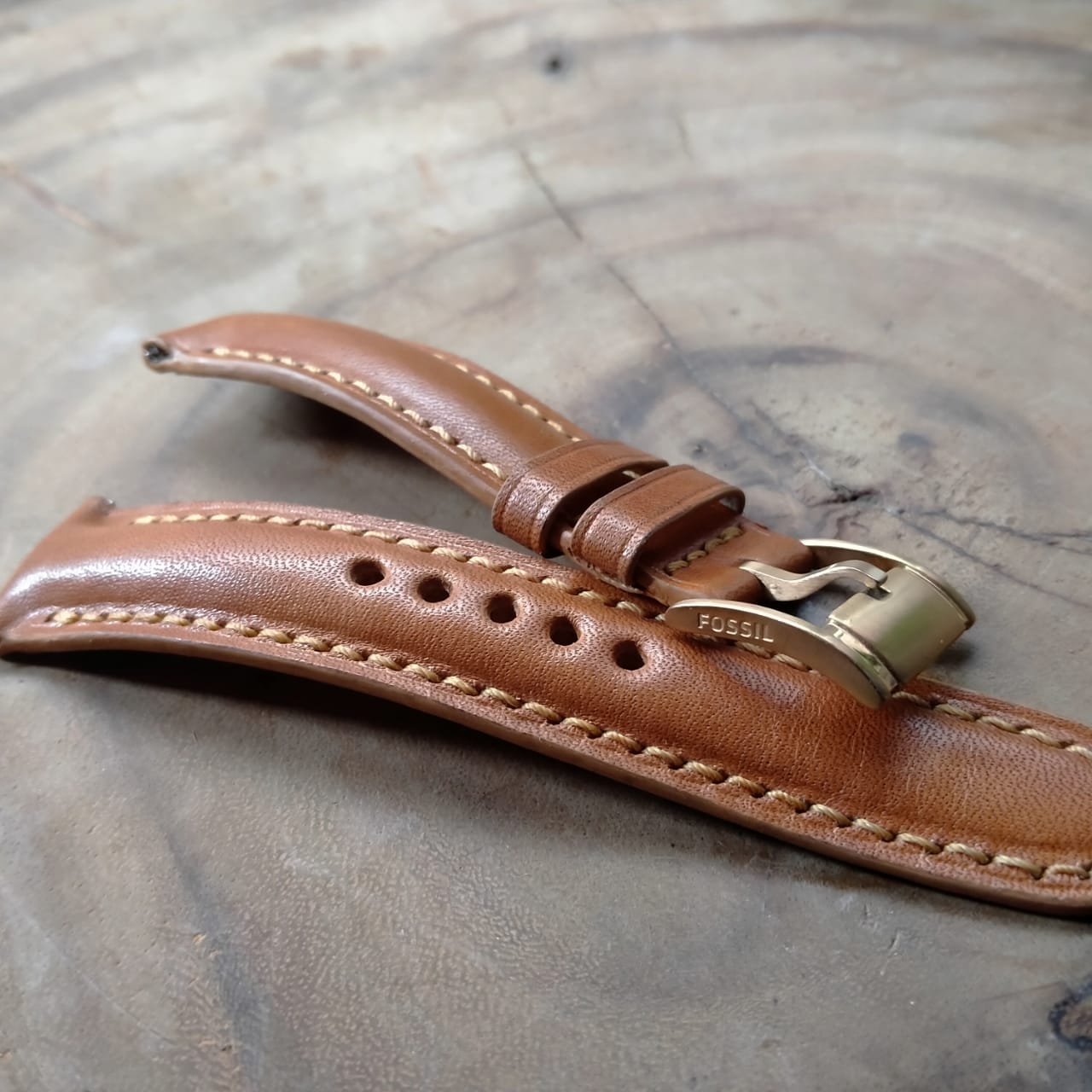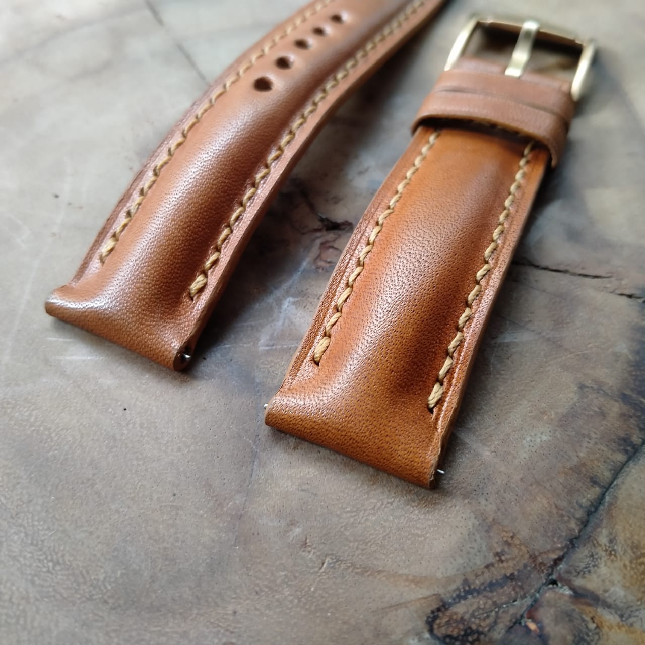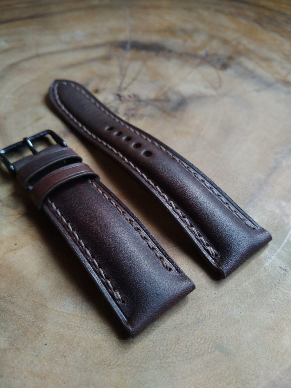 Leather watch straps ini dibuat dengan konstruksi keseluruhan dijahit tangan menggunakan benang Linen dan di finishing bagian pinggir secara halus dengan tampilan natural.